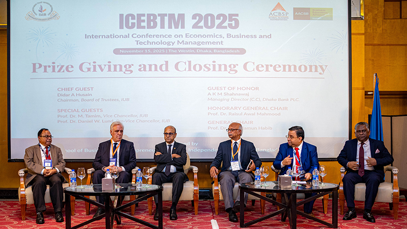 ইনডিপেনডেন্ট ইউনিভার্সিটি, বাংলাদেশের (আইইউবি) স্কুল অব বিজনেস অ্যান্ড অন্ট্রপ্রেনারশিপ (এসবিই) আয়োজিত দুই দিনের আন্তর্জাতিক সম্মেলন ‘ইন্টারন্যাশনাল কনফারেন্স অন ইকোনমিক্স, বিজনেস অ্যান্ড টেকনোলজি ম্যানেজমেন্ট (আইসিইবিটিএম) ২০২৫’ শেষ হয়েছে। ঢাকার ওয়েস্টিন হোটেলে আয়োজিত সম্মেলনটি গতকাল সন্ধ্যায় পুরস্কার প্রদান ও সমাপনী অনুষ্ঠানের মাধ্যমে শেষ হয়।
